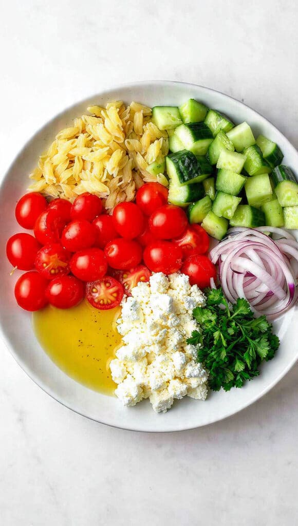 - Combine Ingredients: Cook the orzo according to package instructions until al dente, then drain and transfer to a large mixing bowl.