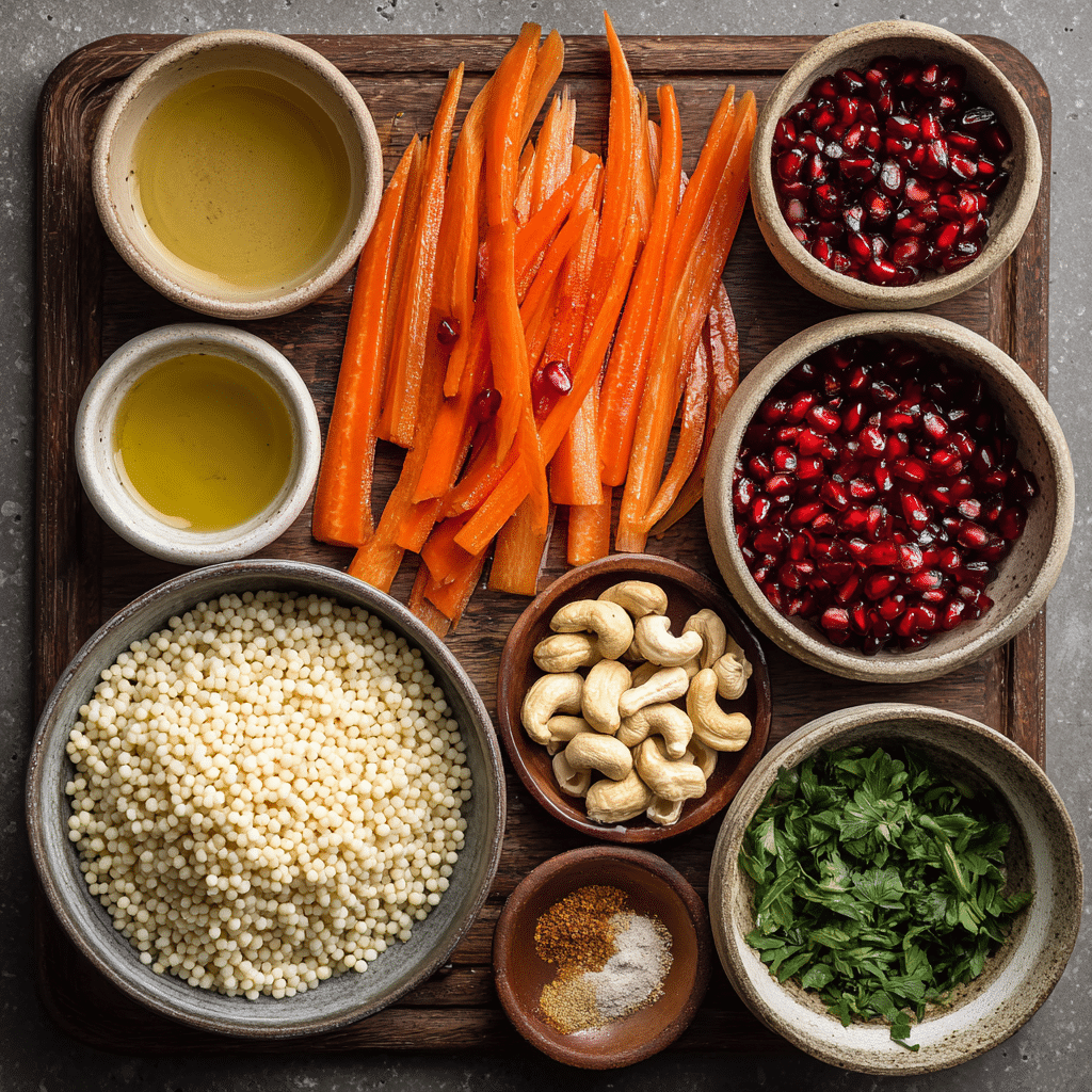 Ingredients in Pearl Couscous with Caramelized Carrots, Cashew Nuts and Pomegranate