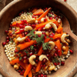 There’s something magical about a dish that’s both vibrant and comforting. This pearl couscous with caramelized carrots, cashew nuts and pomegranate feels like a celebration in a bowl. Each bite offers a different texture and taste — nutty, sweet, juicy, and savory — all mingling together like a well-rehearsed melody. Whether you’re looking for a warm lunch, a dinner side, or a festive centerpiece, this dish brings bold color and bold flavor.