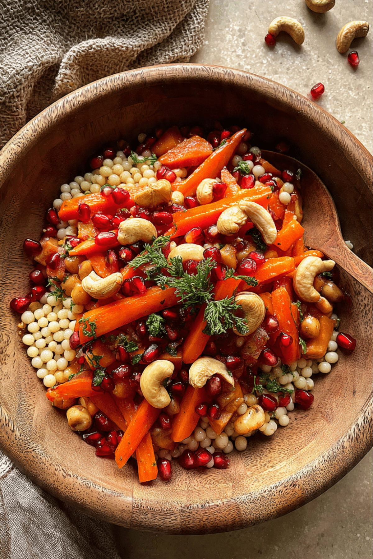 This recipe was born on a lazy Sunday afternoon when I wanted something warm and satisfying, but also bright and a little indulgent. Roasting carrots until sweet and golden, toasting cashews for that buttery crunch, and tossing everything with chewy, pearly couscous felt like a creative experiment. But once the juicy pop of pomegranate came in, it became an instant favorite. This one’s stayed in my kitchen rotation ever since.