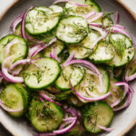 This cucumber salad takes me back to my grandmother’s garden, where we’d pick cucumbers right off the vine. She would slice them paper-thin, toss them with onions, and pour over a quick vinegar dressing that always hit the spot. It was her go-to side for just about every summer meal, and now it’s mine too. Simple, honest, and absolutely satisfying.