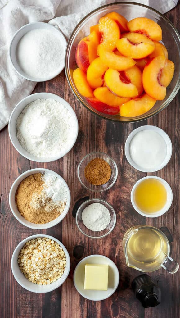 - Fresh Peaches: 6 cups sliced peaches, about 6 to 7 medium peaches, these are the star and provide natural sweetness and juiciness.