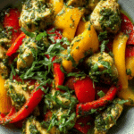 This pesto chicken with sautéed peppers dish is like sunshine on a plate. It’s bold, colorful, and packed with layers of flavor—from the juicy chicken kissed with garlicky basil pesto to the tender, slightly caramelized peppers that bring just the right amount of sweetness and crunch. It’s the kind of meal that looks fancy but is refreshingly simple to prepare, whether you’re serving guests or just need a fast and flavorful dinner.