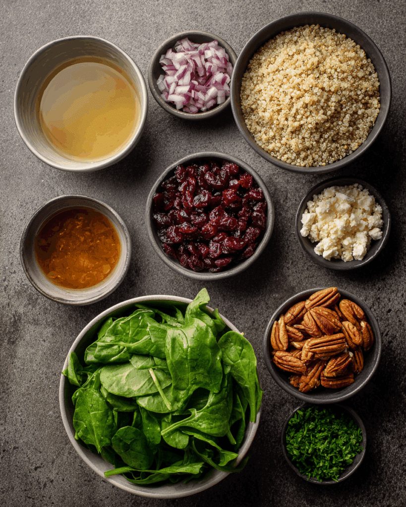 - Combine the salad components: In a large mixing bowl, add the cooled quinoa, 3/4 cup dried cranberries, 3 cups baby spinach or mixed greens, 1/4 cup finely diced red onion, 1/4 cup chopped fresh parsley, the toasted nuts, and 1/2 cup crumbled feta if using.