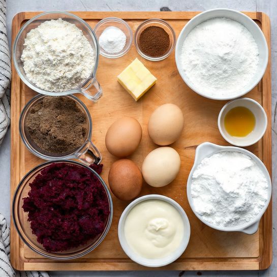 Ingredients in Red Velvet Beet Bars with Brown Butter Sour Cream Frosting