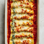 A comforting baked pasta dish filled with creamy ricotta and spinach, topped with rich tomato sauce and melted cheese.