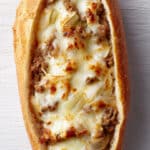 A crispy golden baguette filled with savory minced beef and onion omelette, layered with creamy melted cheese and toasted to perfection. This Southeast Asian street food favorite is hearty, comforting, and packed with bold flavor in every bite.