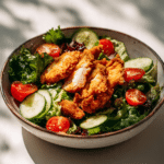 This kind of hearty salad pulls inspiration from modern comfort cooking, where classic pan fried chicken meets fresh salad culture. It is a style that became popular as people wanted meals that felt indulgent but still included vegetables and balance. You see it often in casual cafes and home kitchens, where flexibility and flavor matter most.