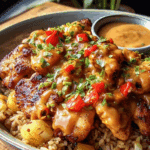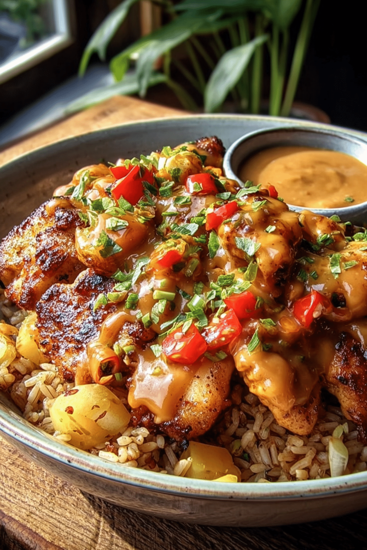 There’s something about the combination of crispy, spicy chicken, fragrant fried rice, and creamy peanut satay sauce that feels both comforting and exciting at the same time. Every bite brings together heat, sweetness, and nutty depth, making it a dish that satisfies every craving in one plate. Picture golden fried chicken tossed with fiery chilies and colorful peppers, paired with fluffy rice that’s kissed by soy and sesame, and finished with a drizzle of silky satay. Trust me, this one’s a total game-changer.