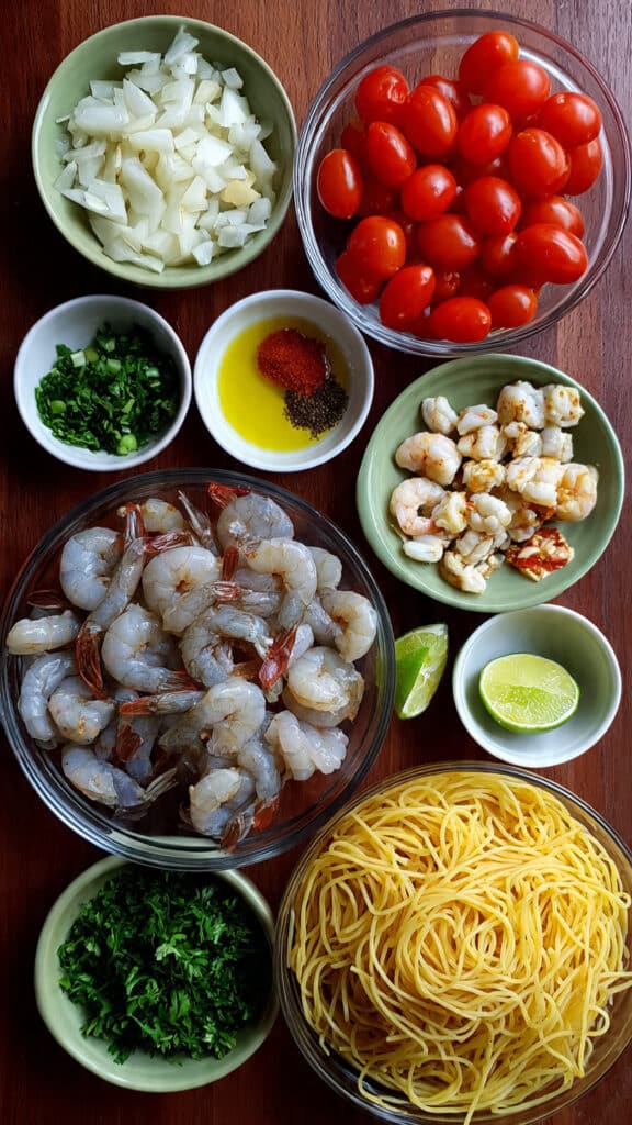 The noodles stay slightly firm, soaking up the rich chili sauce. The prawns are tender and juicy, while the tomatoes burst lightly with sweetness. Each bite gives you spice, savoriness, and a hint of citrus brightness that balances everything beautifully.