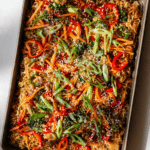 Crispy oven-baked ramen noodles tossed with colorful vegetables and a savory sesame soy glaze, all roasted together on one sheet pan for a crunchy, flavor-packed vegetarian meal.