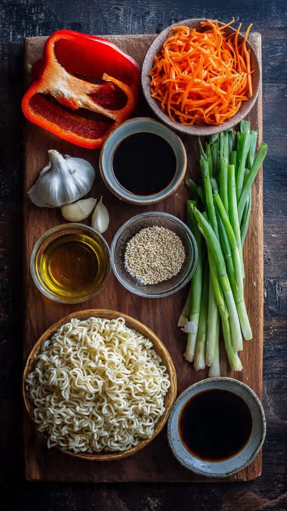 - Combine Ingredients: Break the ramen noodles slightly and place them in a large bowl. Add sliced bell pepper, shredded carrots, garlic, soy sauce, sesame oil, olive oil, honey, and rice vinegar. Toss until everything is evenly coated.