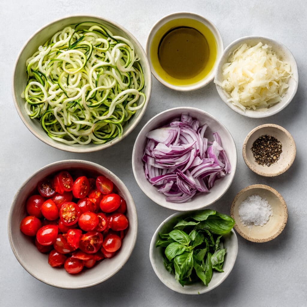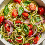 A light, fresh, and flavor-packed zucchini pasta salad featuring spiralized zucchini, cherry tomatoes, red onion, and basil in a lemony olive oil dressing. Perfect for summer lunches or healthy sides.