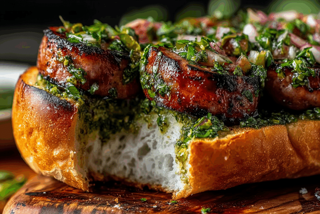 This sandwich is perfect for planning ahead. Make the chimichurri up to 2 days in advance and store it in the fridge. Cooked sausages can be refrigerated for 3 days or frozen for a month. Reheat gently in a skillet or oven to maintain juiciness before assembling.