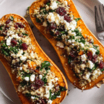 Roasted butternut squash halves filled with a savory mix of quinoa, spinach, cranberries, and feta for a cozy, colorful, and satisfying vegetarian meal.