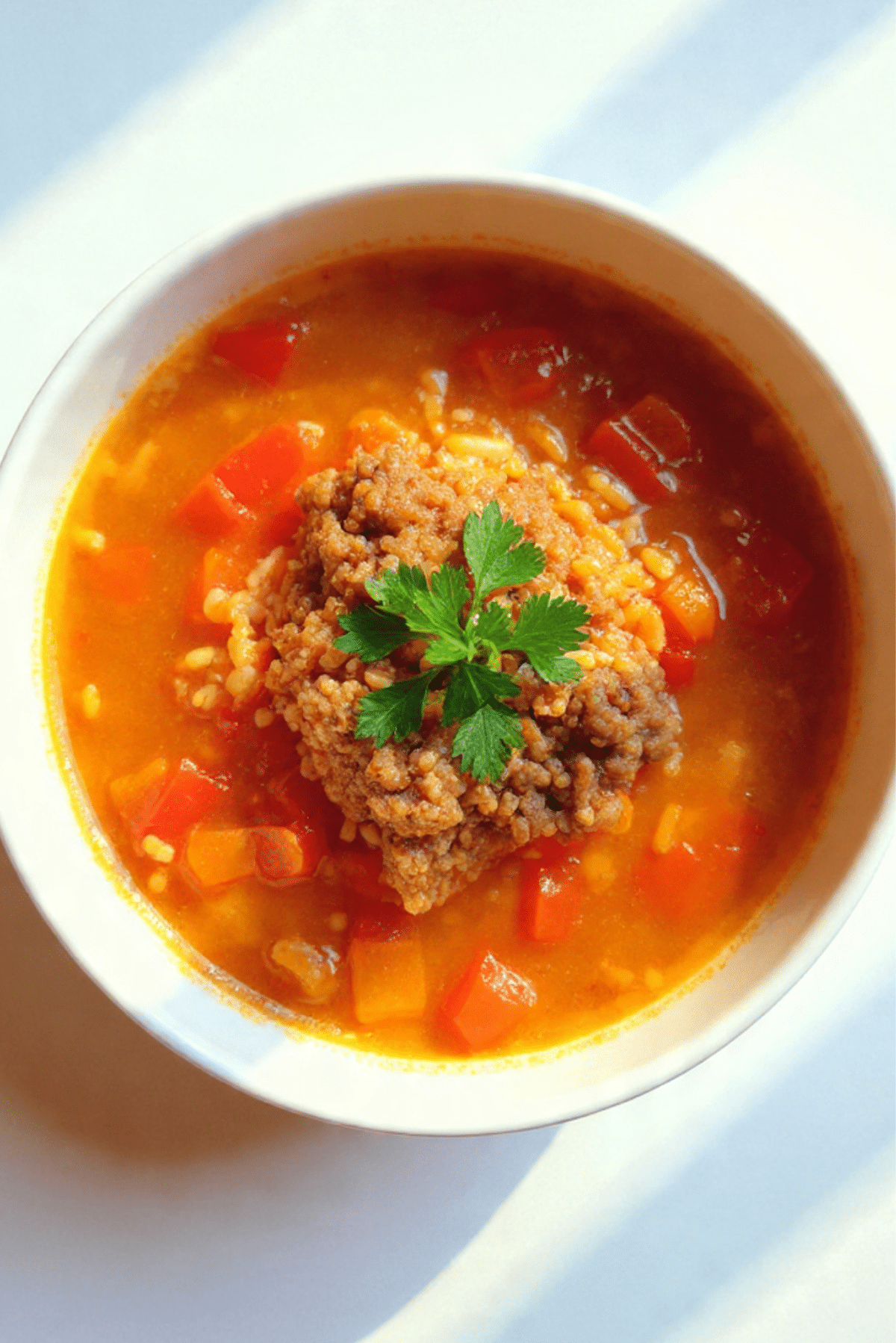 The beauty of this soup lies in its contrast. The peppers stay slightly crisp, the rice is tender, and the ground beef brings a rich, meaty bite. The tomato broth is savory with just a hint of sweetness from the peppers and acidity from the tomatoes.