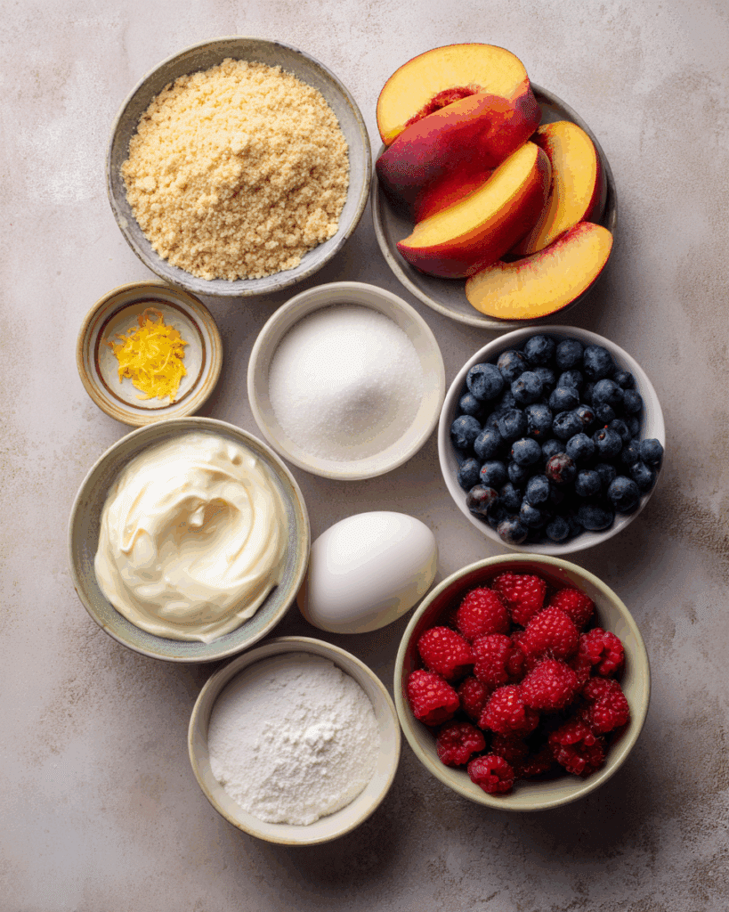 - Assemble the Dish: Pour the batter over the crust. Arrange sliced peaches and berries on top for a beautiful, colorful layer.