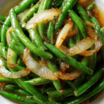 Present your green beans in a white shallow dish with some of the glossy broth pooled around the edges. Garnish lightly with cracked black pepper or a few onion strands for a polished, rustic look.