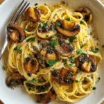 Presentation matters. Twirl the pasta into little nests before plating. Garnish with shaved Parmesan, cracked pepper, and a tiny thyme sprig. Use a shallow bowl to showcase the glossy sauce and golden mushrooms.