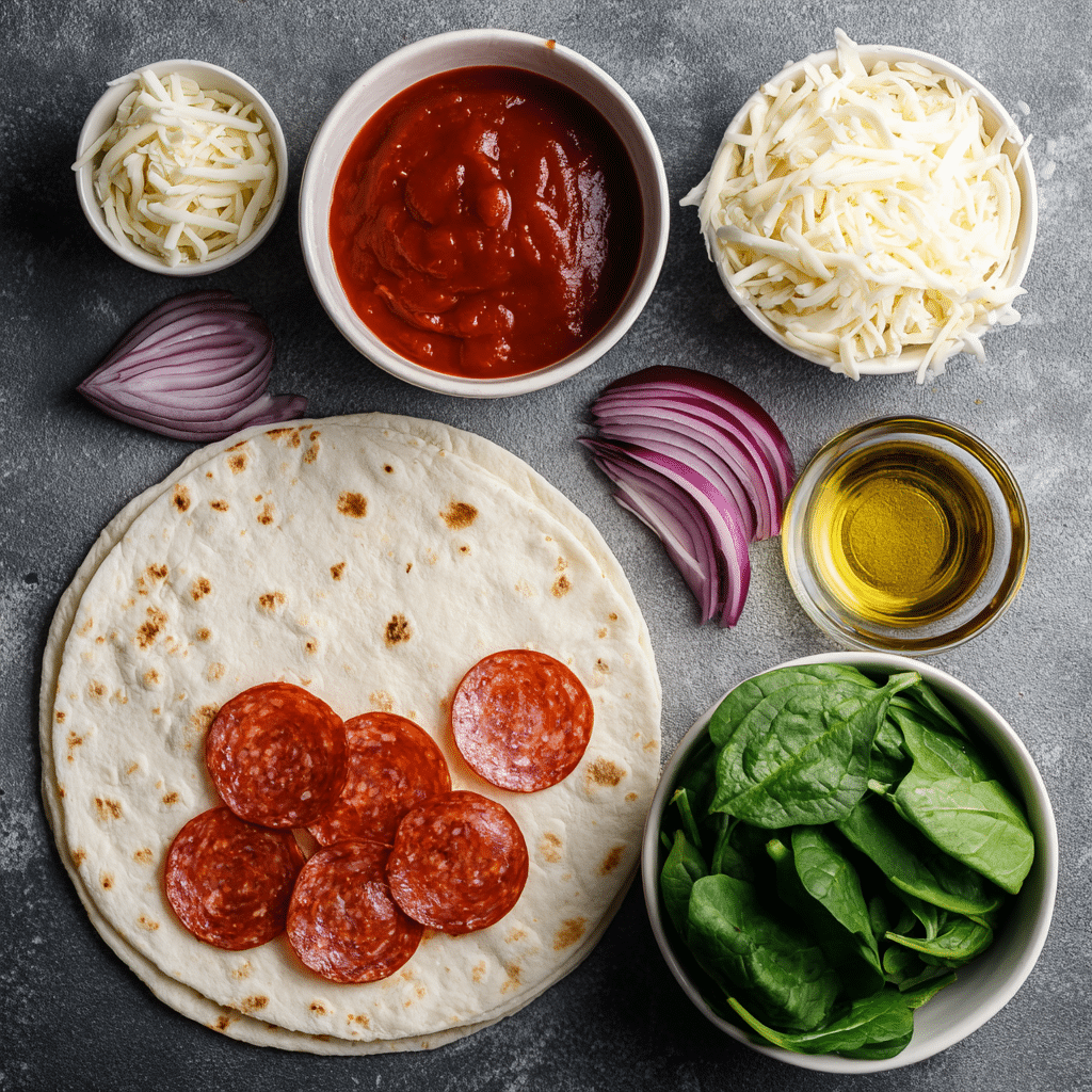 - Cut a slit from the center of the tortilla to the edge, then spread pizza sauce thinly on one quadrant, sprinkle mozzarella on the next quadrant, and arrange pepperoni, bell pepper, onion, and spinach across the remaining quadrants. Fold each quadrant over itself to form a neat triangle.