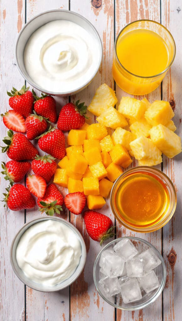 - Combine Ingredients: Add strawberries, mango, pineapple, Greek yogurt, orange juice, honey, and ice cubes into the blender.