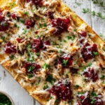 Sometimes the best meals are born from leftovers, and this Turkey Cranberry Flatbread is one of those magical creations. Crispy flatbread becomes the canvas for tender shredded turkey, rich cranberry sauce, gooey melted cheese, and fresh herbs that tie it all together. The contrast of savory and sweet is irresistible, and it’s one of those dishes that smells like comfort and tastes like celebration.