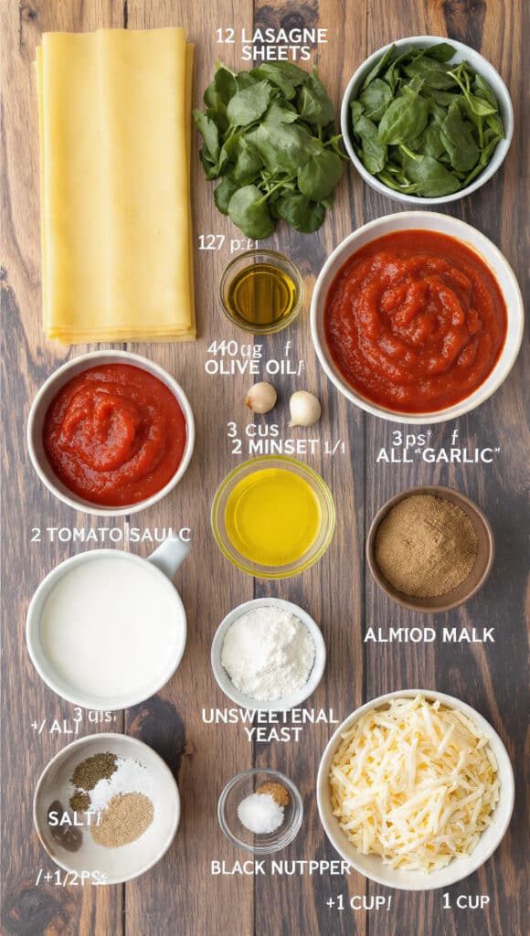 - Assemble the Dish: Spread a thin layer of tomato sauce in the baking dish. Add a layer of lasagne sheets, then spinach, béchamel, and more tomato sauce. Repeat until all ingredients are used, finishing with béchamel and vegan mozzarella on top.