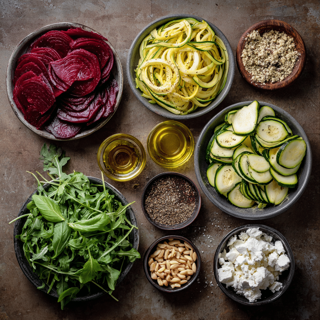 This dish is a celebration of contrast. The thin beet and zucchini slices are tender yet crisp. The arugula adds a peppery snap, while the feta provides a creamy bite. Pine nuts give it that buttery crunch, and the lemony dressing ties it all together with zesty freshness.