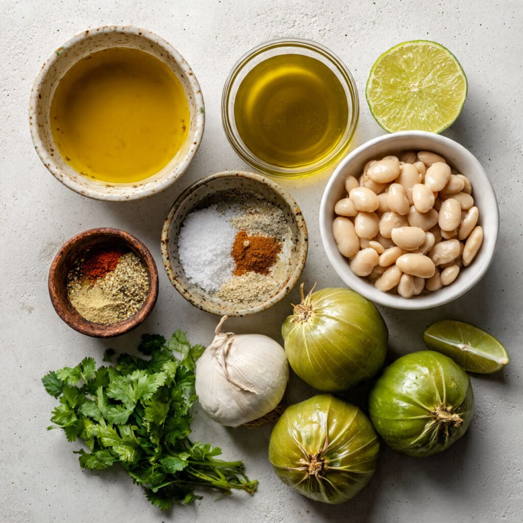 Tomatillos: These small green fruits may look like unripe tomatoes, but their tangy flavor is what makes them shine in Latin cooking. They add brightness that balances the creamy white beans perfectly.